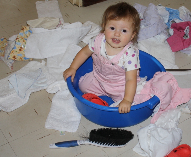 The endless laundry parade.  As in any country, washing laundry is a constant chore, especially when using cloth diapers.  I don’t mind too much.  It adds rhythm to my life :).  Here, we hang our laundry outside to dry on the bottom terrace of our yard, so I even get more exercise, too!  This chore usually draws the children outside, even if they were stubborn to leave the house earlier in the morning.  Rachel is still small enough to ride down in the clothing bin, which she loves.