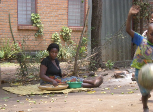 I breathed a quick prayer that the kids would not “expire” as I call it (deteriorate into crying, clinging and tantrums) before I could learn from her, for I assumed this would not be a quick and easy task.  While she prepared the pumpkin leaves for the relish, we chatted on the mat in her yard.  I practiced what little Chichewa I could muster and we got to know each other.  Thankfully, she speaks English fairly well, too!